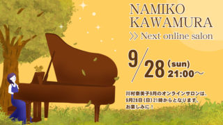 朝夕がめっきり涼しくなり、過ごしやすい日々が続いておりますが、皆様にはいかがお過ごしでしょうか?明日9月28日の川村奈美子のオンラインサロンは、21時からとなります。